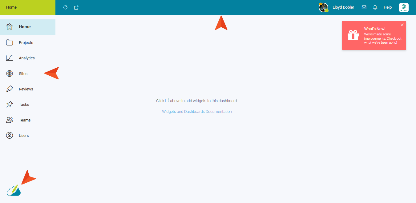 Opens the Home page dashboard, where you can add widgets pointing to various information in the system. See Dashboards and Widgets. |