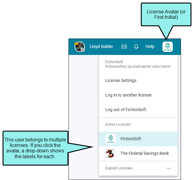 The license key label is used internally to identify your MadCap Flare Online license. If you belong to multiple MadCap Flare Online licenses, a unique label ensures that you can distinguish between them in Flare Online. In addition, the first initial of the license, or a custom avatar, can be helpful to quickly find it (see Setting a License Avatar).