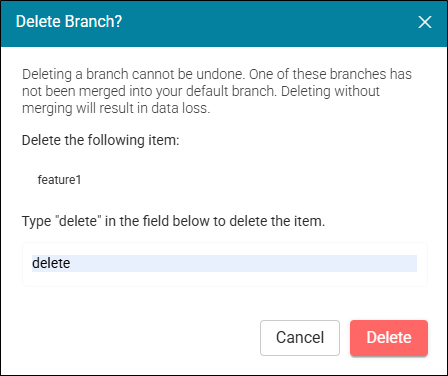 In the Delete Branch dialog, type a confirmation for the action and select the Delete button. The branch is removed from the grid.