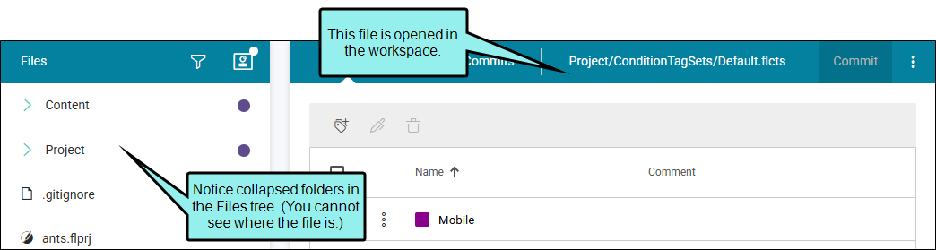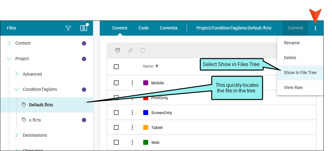 The workspace vertical three-dot menu includes a Show in File Tree option—evident in the Content Editor for all file types. This feature locates the file in the project Files tree. For example, if folders display collapsed in the workspace Files tree, you can select this option to expand the folders to reveal the location of the file.