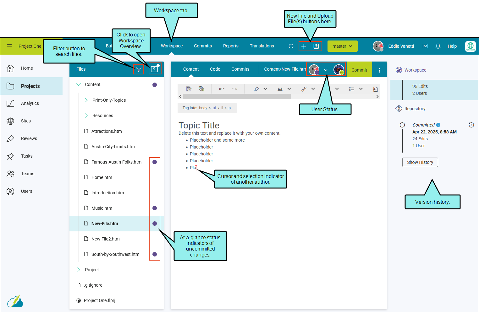 When you open a project, click the Workspace tab from the main toolbar. The elements found on the Workspace page let you edit content but also provide real-time knowledge about your documentation project—such as who is editing what.