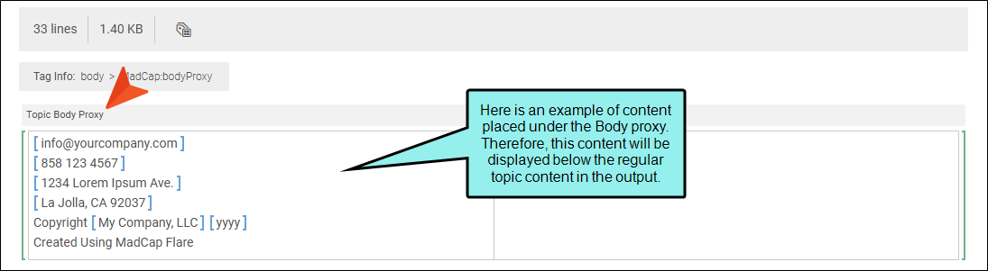 A Body proxy is a placeholder for content from your topics. If you manually enter additional content above the Body proxy bar in the template page, the content will display as a header (above the topic body) in the output. If you enter the content below the Body proxy bar in the template page, the content will display as a footer (below the topic body) in the output.