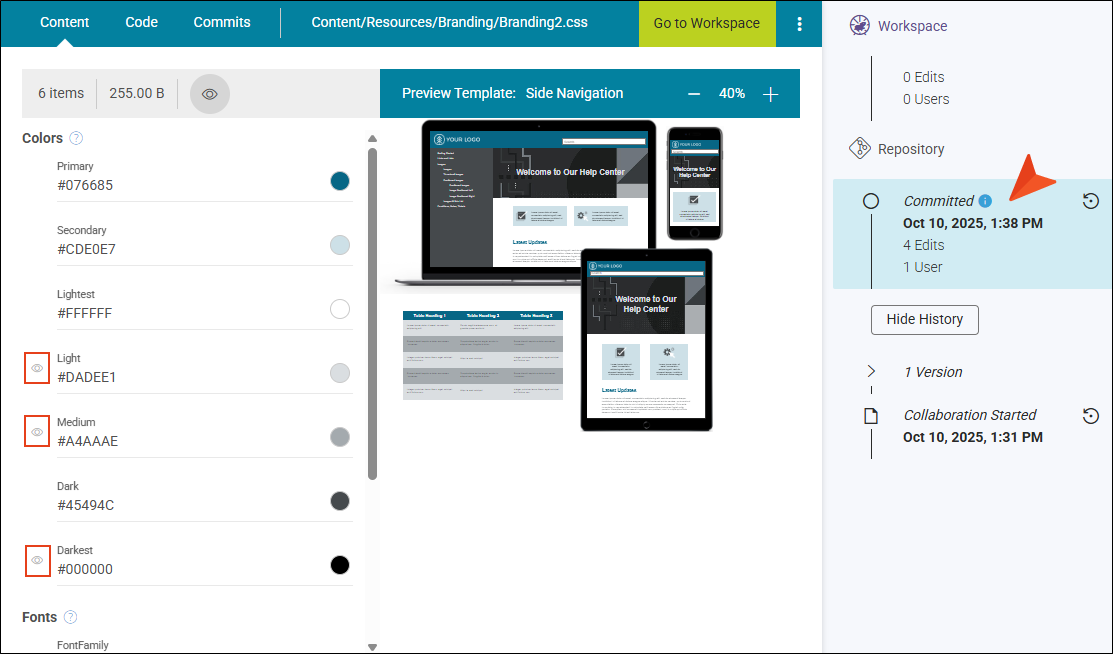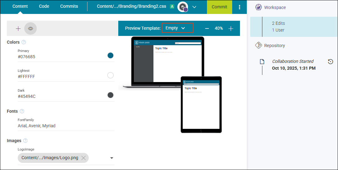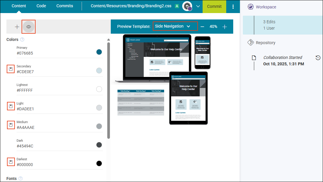 3. Click in the editor to update branding elements (e.g., color palette, logo, hero image, font), and see your choices update in the Preview. You can also manage branding properties in your stylesheet.