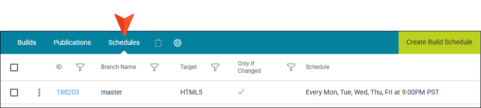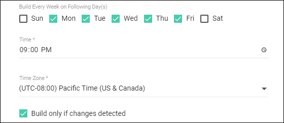 Example You want to schedule a target to be generated automatically. You want the target to be build every work day (Monday-Friday) at 9 p.m. Pacific time.