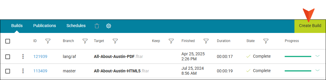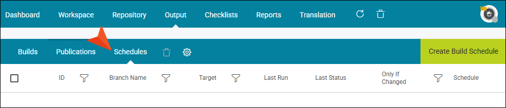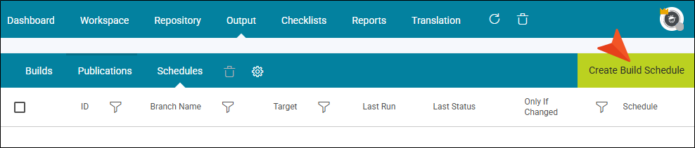 If you are associated with projects in Flare Online, you can open the Output view of the Projects page. From here, you can manually build targets (such as HTML5, PDF, and others), or you can schedule targets to be generated. If you are using branching, you can build output for a specific branch.