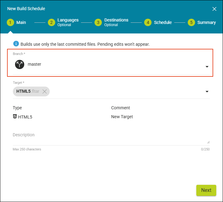 4. From the Branch field, select the appropriate branch. If you are not using branching, you will always be building from the master branch.
