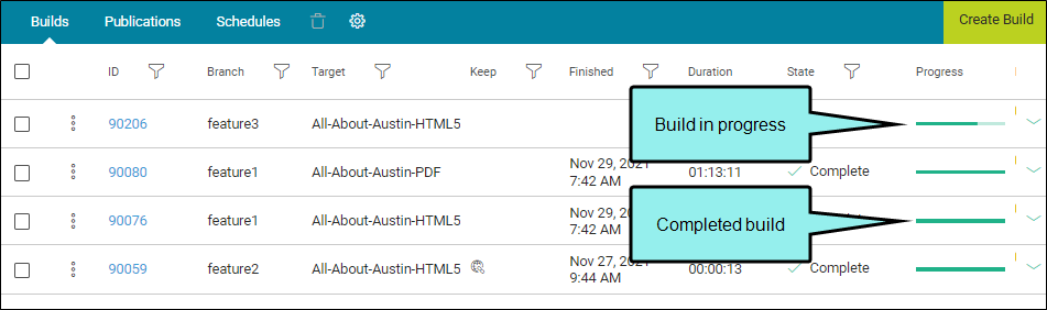 A row is added to the page, showing the progress of the target as it is generated. If the target generates successfully, the color of the Progress column changes from light to dark green, and the State column displays “Complete.”