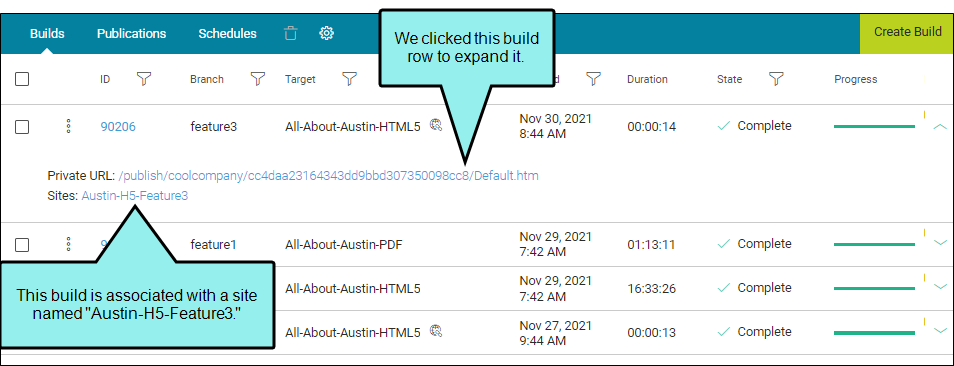 If you click a build row (not the check box), the row expands, showing details about the selected build (i.e., the private URL and whether the build is associate with a site).