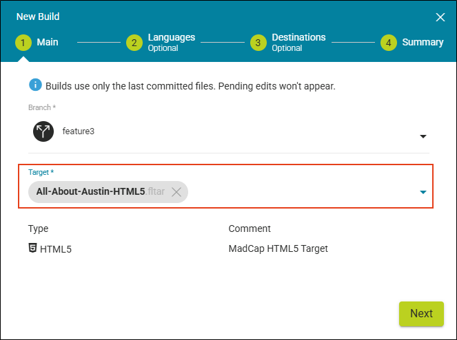 8. (Optional) For single language output you can skip this screen, and select Next. However, if you want to build multilingual output you can select an additional language branch. See Generating Translated Output.