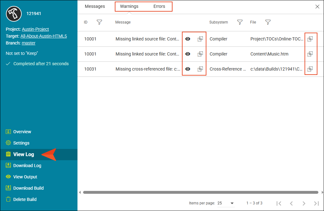 View Log Displays the log for the build, with tabs showing messages, warnings, and errors.