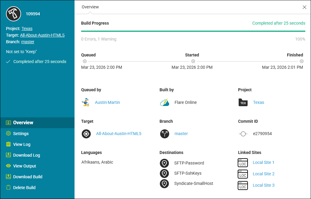 Download Build Downloads the output files for the build into a ZIP file.