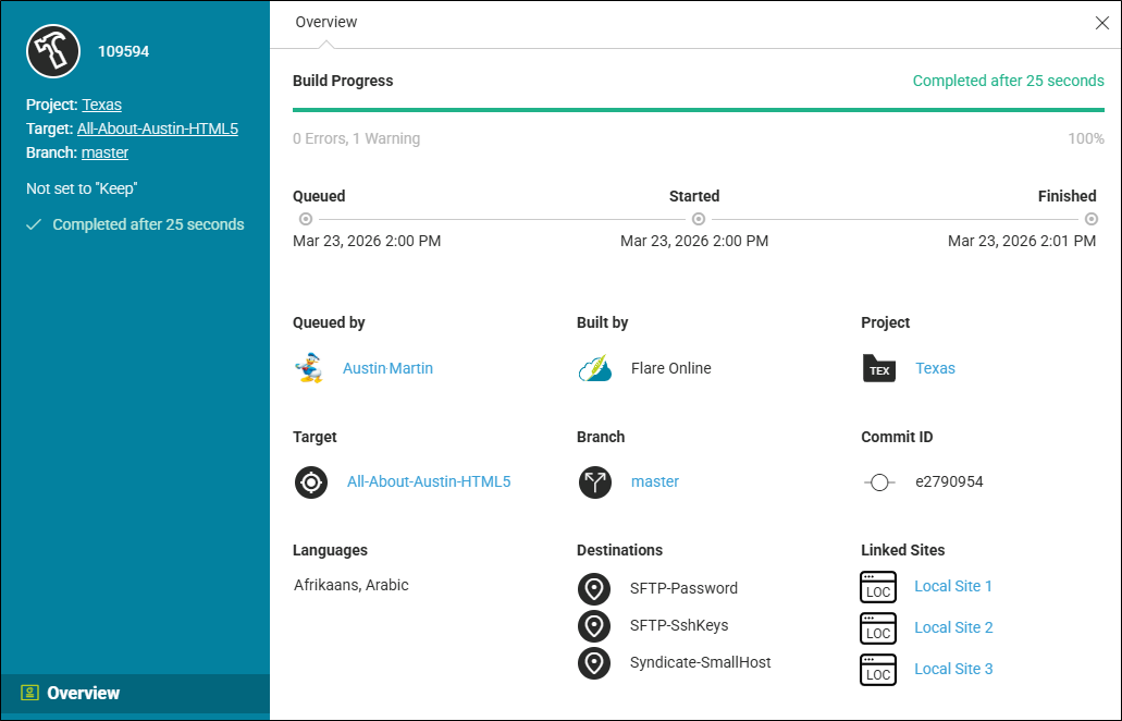 To open the project in Flare Online and access the Build Profile dialog, you must be associated with the project. However, depending on your permissions, you might see different section links on the left side of the dialog.