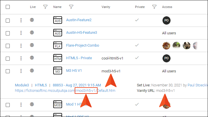 You want this Module 3 Version 1 documentation to have a unique path, different than the paths for other modules, and different than later versions of Module 3. So you create a new site for this output. You decide to name it M3 H5 V1, and you give it a vanity with a similar name: mod3-h5-v1.