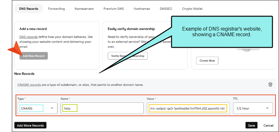 6. Open your DNS registrar's website, add a CNAME record. Be sure to save the record.