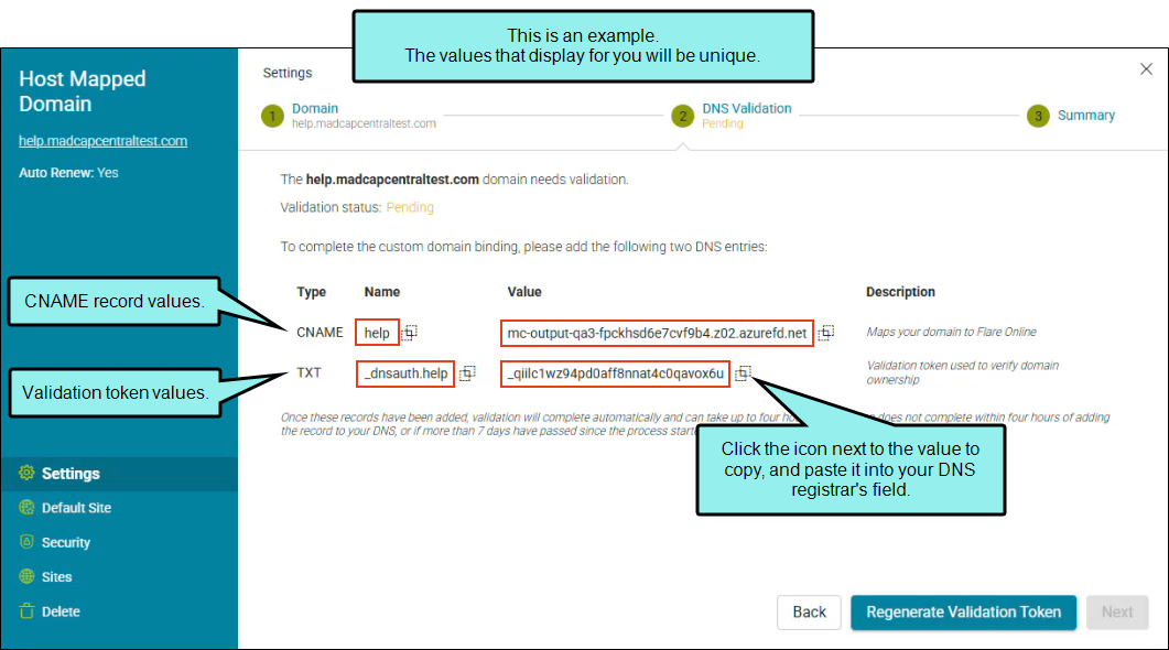 5. In the Host Mapped Domain profile, the DNS validation states change from Submitting to Pending. When the binding finishes, the profile screen updates to a table showing a CNAME and a validation token (i.e., TXT type) that you need to enter in your DNS registrar’s website. Use to copy the values into the DNS provider.