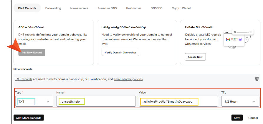 7. In the DNS registrar's website, add a TXT record (i.e., validation token). Be sure to save the record.