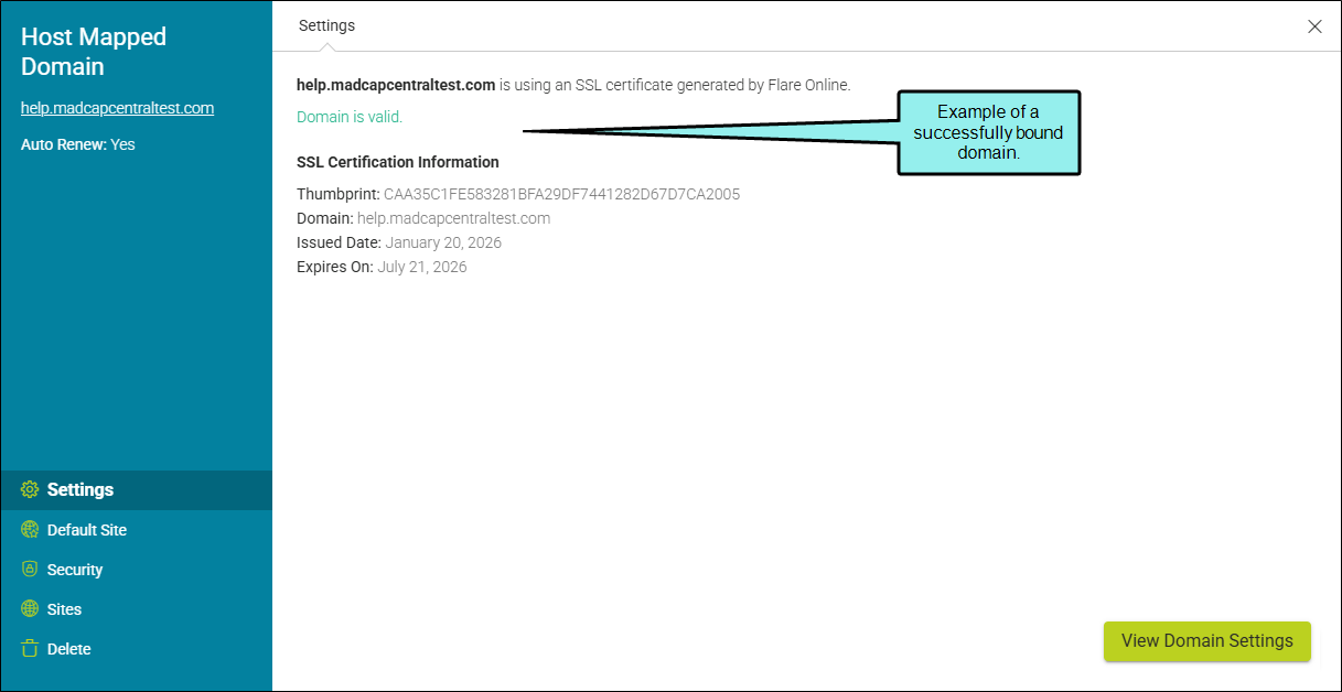 If you want to map to your company's own host domain instead of using the default Flare Online domain, you can do so by creating a Canonical Name (CNAME). You can add as many host mapped domains as you need. The URL to give end users will be your company’s domain.