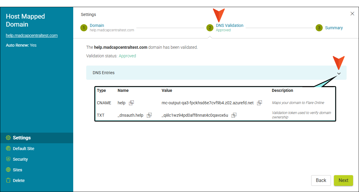 For example, you can click the DNS Validation at the top to review the approved validation. Click the drop-down to view your DNS Entries.