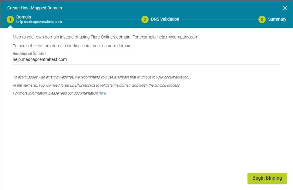 4. The Create Host Mapped Domain wizard displays. Enter your custom domain name (e.g., help.madcapcentraltest.com) and click Begin Binding. This creates a record in the database and the domain in Azure Front Door. It closes the wizard and initiates the Host Mapped Domain profile to show the domain creation is in progress. The system checks for 1) if the domain name is already being used in the database, and 2) if the domain string is valid.