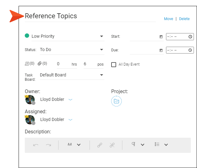 • Project Click if you want to select a project. This associates the project with that task, and anytime users open the task, they can click the project link to open it in the Projects page.