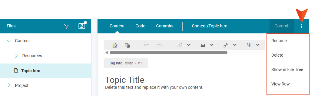 When you click a file in the workspace, to the right of the Commit button you will notice a vertical three-dot menu in the Content Editor’s local toolbar. For a file in a committed state, the menu displays with Rename, Delete, Show in File Tree, and View Raw options.
