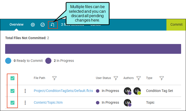 Note Discarding changes can affect other users. Because collaborative authoring is always happening, authors discarding changes are doing so not only for their changes, but also for any other author's changes for the same file. For this reason, it's important to stay in communication with other authors to make sure you are not deleting edits that they may wish to keep. However, the editing process includes safeguards and visible cues in the interface to commit files without issues.
