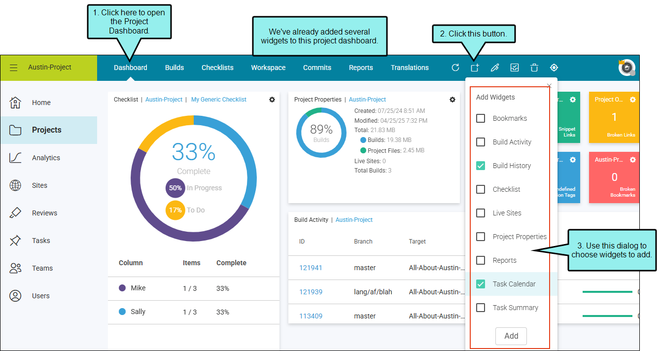 After you’ve added content and information (e.g., projects, tasks) to your license, you will probably want to add widgets to your Home and Project dashboards. For example, on your Home dashboard you might want to see widgets showing storage and usage, project bookmarks, reports, build activity, and a task calendar. And on your project dashboards, you might want to see widgets showing project properties, live builds, checklists, and target build history.